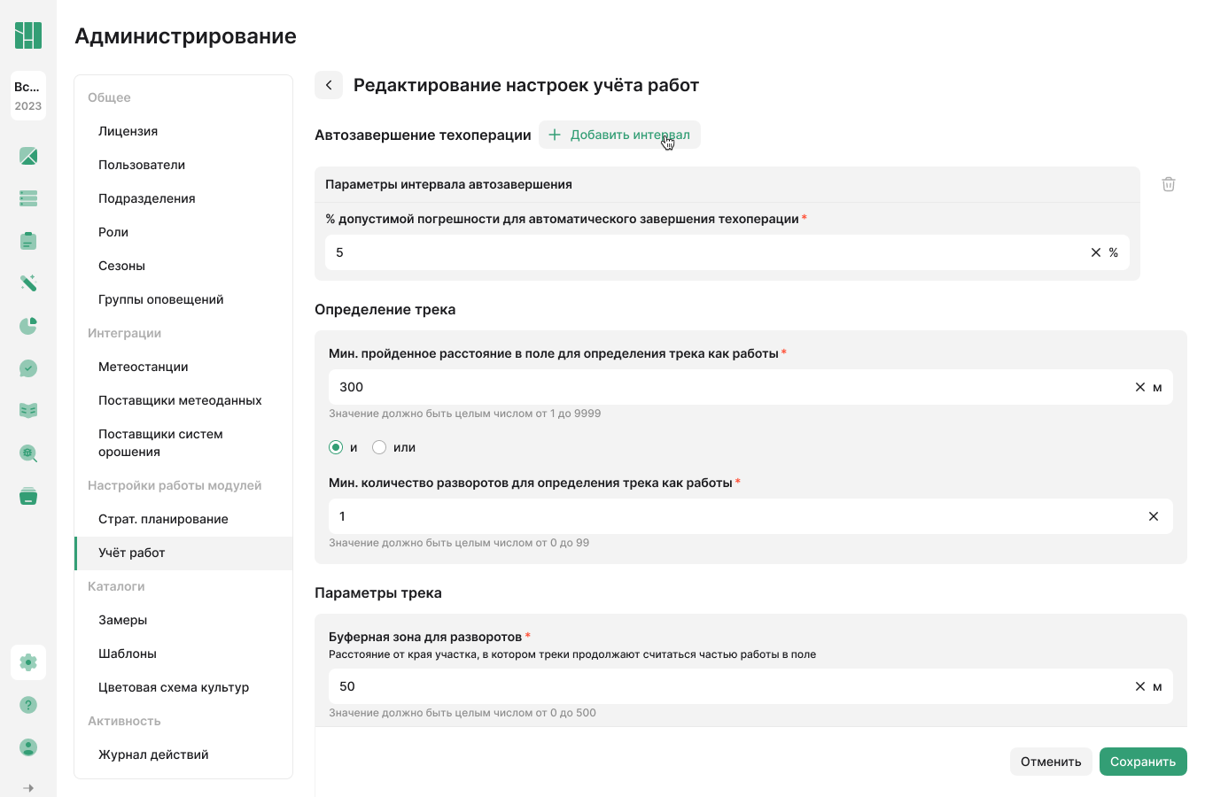 - Параметры трека – выбор длины буферной зоны от края поля для учета разворотов техники; настройка параметров для определения трека как перегона, а не работы; задание допустимого времени покидания участка.
